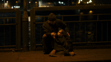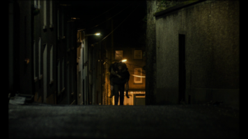 Lo mismo podemos decir del encuadre que resalta la pendiente que tiene que subir cada día, cabizbajo, de regreso a casa.