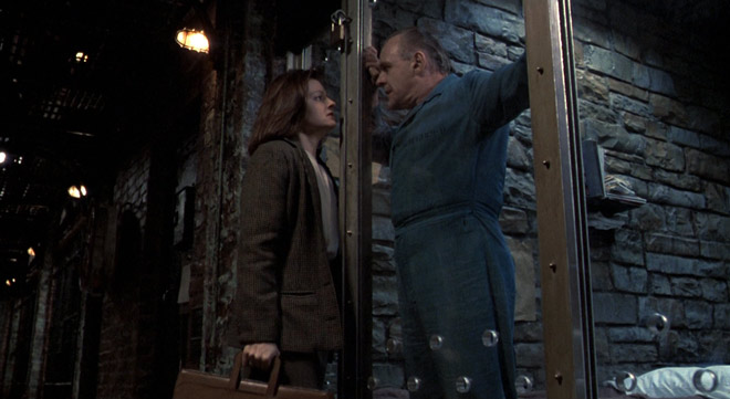 Sin dejar los años noventa nos adentramos en la investigación criminal del FBI y en la retorcida psique de uno de los más famosos asesinos en serie que ha dado el cine. Vamos a hablar de la magnífica película El silencio de los corderos (The Silence of the Lambs, Jonathan Demme, 1990). Fijémonos de qué manera el guionista Ted Tally saca provecho inteligentemente de la situación en cuánto al perfil psicológico de Clarice Starling y de cómo utiliza, en la misma escena, el texto para hacer avanzar la historia; otro poder que se le otorga al diálogo. Pongámonos en situación: Clarice Starling (Jodie Foster) es una agente del FBI que busca a un despiadado asesino en serie llamado “Bufallo Bill”. Para dar con él, necesita la ayuda de otro asesino y caníbal de inteligencia superior: Hannibal Lecter (Anthony Hopkins), que se encuentra recluido en una prisión de alta seguridad.