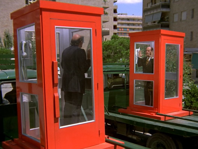 Antonio Mercero y José Luis Garci escenifican el agobio de un señor medio, encarnado con manifiesta espontaneidad por un inspirado José Luis López Vázquez, que pulula por un espacio tan rutinario y aparentemente inocente como un pequeño parque de recreo y paseo. En este marco para el ocio y el descanso, captado con un plano general en picado, a vista de pájaro, unos operarios vestidos de verde instalan una cabina telefónica de reluciente y llamativo color rojo. Un objeto banal y acomodado a la iconografía de las ciudades en progreso y que representa tranquilidad y rutina, además de un servicio utilizado con profusión. Por lo tanto, nada hace sospechar que sea un cebo y menos en un paraje ideado urbanísticamente para el desahogo, el entretenimiento y la interrelación con otros seres humanos.