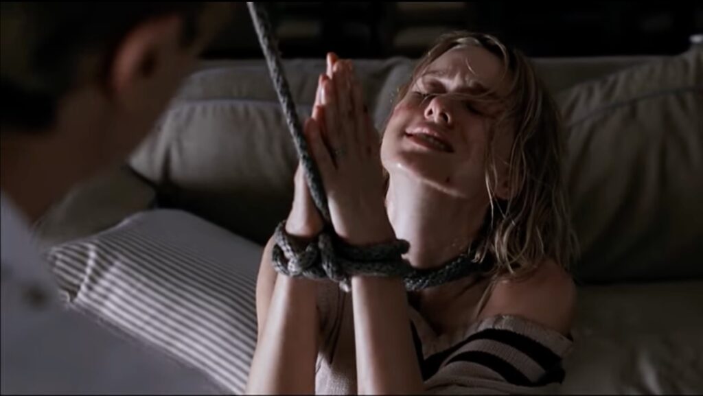 Víctima y espectador son colocados en una posición sin salida. La imposibilidad de elegir, y por tanto de salvarse, se expresará mediante las apuestas que los sádicos impondrán a las víctimas.