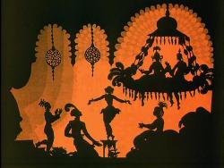 Luego de aterrizar accidentadamente, el príncipe Achmed irrumpe en un palacio repleto de cortesanas que caen rendidas a sus pies y le ofrecen todo tipo de manjares para que permanezca con ellas. Esta secuencia, sin dudas, representó un gesto muy audaz para la época, ofreciendo a los espectadores la figura de un protagonista intrépido con muy buena predisposición para la acción, el romance y la aventura, y saciando esa sed de exotismo tan propia del público de las primeras décadas del cine. Luego de huir de las tentaciones del palacio, el joven y valiente príncipe se introduce en los bosques y avista a la bellísima Pari Banu, la diosa de aquellas tierras. Escondido entre los arbustos, el príncipe espía a la divinidad mientras esta toma un baño nocturno en las aguas del lago en compañía de dos cortesanas. La maravillosa orquestación de Wolfgang Zeller exalta el erotismo del momento y los primeros planos de Achmed, deslumbrado ante la belleza de Pari Banu, conmueven en toda su expresividad voyeurística. Es esta, sin dudas, la secuencia que mejor resume todo el encanto y las posibilidades del cine de Lotte Reiniger, un instante donde su técnica se funde indisolublemente al contenido y nos maravilla por completo en todo su esplendor. Sus cautivantes juegos de metamorfosis visual, particularmente en las escenas en donde emerge la figura del genio de la lámpara de Aladino o en las del Mago Africano, dando forma a su caballo alado, son de una plasticidad virtuosa y emocionante.
