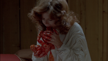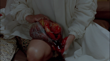 La mujer rompe la membrana para que nazca otro niño monstruoso mientras el doctor rescata a la niña en la escena a la vez más zoe y más gore de la película para lamer inmediatamente y limpiar al nuevo ser.