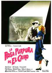 La_rosa_purpura _de_El_CairoUna de las películas imprescindibles en este recorrido es, necesariamente, La rosa púrpura de El Cairo (The Purple Rose of Cairo, 1985), en la que se produce una apasionante mezcla de realidad y ficción. Cecilia (Mia Farrow), una mujer desgraciada que vive una relación tormentosa con su marido (Danny Aiello), que es un borracho y se gasta todo su sueldo de camarera, se refugia en un modesto cine de barrio, el Jewel, donde están proyectando precisamente La rosa púrpura de El Cairo, que la protagonista ha visto ya muchas veces. Sucede lo inesperado cuando uno de los personajes de la película, interpretado por Jeff Daniels, sale de la pantalla y vive un idilio con Cecilia. Años más tarde, John McTiernan rodaría un remake en clave de acción, El último gran héroe (Last Action Hero, 1993). Hay quien quiere ver en La rosa púrpura de El Cairo una relectura del mito de la caverna de Platón, y hay quien la considera como uno de los grandes homenajes que se han hecho al séptimo arte desde dentro mismo del cine. Aunque hay varios niveles de lectura, lo que está claro es que el cine sigue siendo un lugar al que podemos ir para escapar de una vida que no nos gusta.