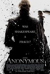 Anonymous comienza y acaba en el Nueva York actual, cuando un director de teatro (Derek Jacobi) acude al estreno de un espectáculo que se llama igual que la película, "una tétrica historia de pluma y espada". Los espectadores de cine, por tanto, nos convertimos en un público de teatro que asiste a una función, pero pronto dejamos de ver la tramoya y el escenario desaparece. Una vez en el Londres isabelino, se producen varios saltos temporales y ya nos encontramos totalmente inmersos en la película, que retrata la vida de Edward de Vere, Conde de Oxford (Rhys Ifans), convertida en una suerte de tragedia griega, acaso shakespeareana. Por un lado, Anonymous se centra en sus relaciones con la reina Isabel I, en su amistad con el Conde de Essex (Sam Reid) y el Conde de Southampton (Xavier Samuel), y en los enfrentamientos con su suegro y su cuñado, Sir William (David Thewlis) y Sir Robert Cecil (Edward Hogg). Oxford es un escritor atrapado en un mundo el que nadie escribe, de ahí que busque la complicidad de Ben Johnson (Sebastian Armesto) y William Shakespeare (Rafe Spall) para dar a conocer sus obras.