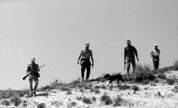 De sus primeros trabajos en blanco y negro es La caza (Carlos Saura, 1966), donde se nos ofrecen amplias panorámicas del campo español, exteriores que bien podrían haber sido iluminados con la brillantez del sol del verano. Sin embargo, Cuadrado utiliza fotografía de alto contraste y busca una tonalidad mate para conseguir mayor realismo en un paisaje, cuya principal característica es la aridez bajo un sol candente, que acompaña el encuentro, años después, entre tres veteranos de la Guerra Civil, para cazar conejos en un campo que aún tiene las huellas de la batalla. Su relación se irá deteriorando, debido a los resentimientos que surgen entre ellos, y desembocará en situaciones violentas hacia el final del día, cuando la atmósfera se haya vuelto más opresiva. Una trama que comienza con cierto dejo costumbrista para derivar en el desenlace dramático, con el paisaje como protagonista.
